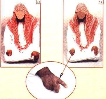 يضع يده اليسرى على فخذه الأيسر وركبته اليسرى، واليد اليمنى مثلها لكن يقبض الأصابع الثلاثة، ويضع إبهامه على إصبعه الوسطى كأنه يشكل دائرة، ويشير للأمام بالسبابة (الأصبع الذي يلي الإبهام). ويستمر هذا طول التشهد، إذ لا دليل نقلي على ربط هذا بالتشهد، ولا يحرك السبابة لأن الحديث الذي يذكر هذا غير صحيح. والله أعلم.